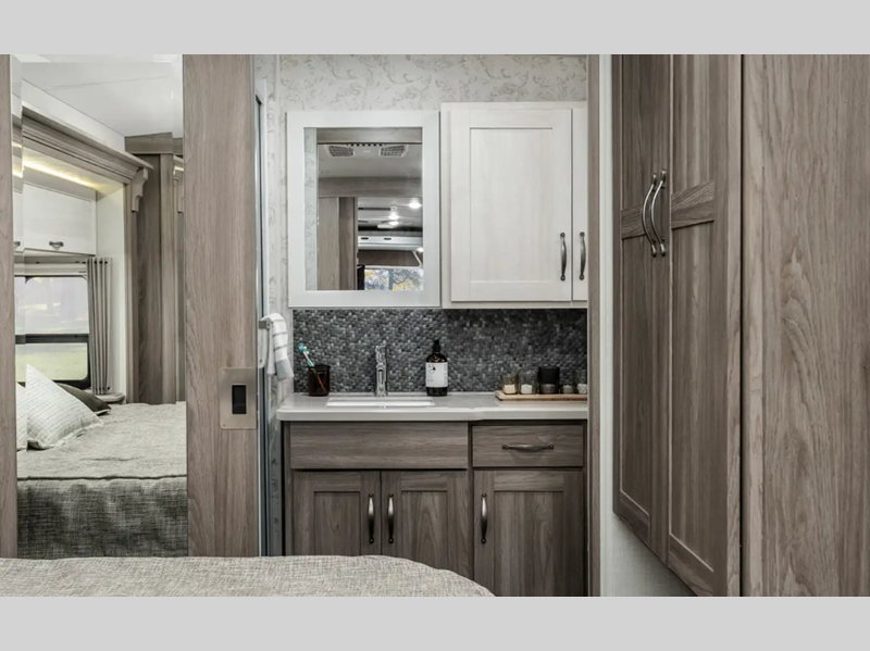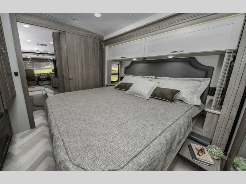 Sleeps 5 Slides 2 Length 35 ft 10 in Ext Width 8 ft 6 in Ext Height 12 ft 1 in Int Height 6 ft 10 in Interior Color Organic Comfort Dark, Organic Comfort Light, Bohemian Oasis Exterior Color Full-Body Paint; Silvermist, Wedgewood ll, Steel Grey, Night Sky Hitch Weight 5000 lbs GVWR 22000 lbs Fresh Water Capacity 74 gals Grey Water Capacity 51 gals Black Water Capacity 63 gals Tire Size 22.5" Furnace BTU 40000 btu Generator 5,500-Watt Cummins Onan Marquis Gold Fuel Type Gas Engine 7.3L V8 Chassis Ford F53 Fuel Capacity 80 gals Wheelbase 228 in Available Beds King Refrigerator Type Stainless Steel Residential with Ice Maker and Water Dispenser Convection Cooking Yes Cooktop Burners 3 Shower Size 36" x 36" Number of Awnings 1 Axle Weight Front 8000 lbs Axle Weight Rear 15000 lbs LP Tank Capacity 76.14 lbs Water Heater Capacity 10 gal Water Heater Type 110V/LP AC BTU 28500 btu Basement Storage 137 cu. ft. TV Info LR 39" HDTV, BR 32" HDTV, Ext. 32" HDTV Awning Info 16' Power w/LED Lighting Washer/Dryer Available Yes Gross Combined Weight 26000 lbs Shower Type Standard Electrical Service 50 amp Similar Floorplans